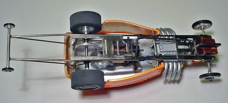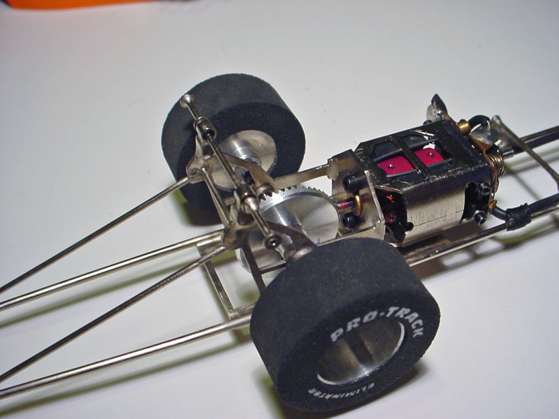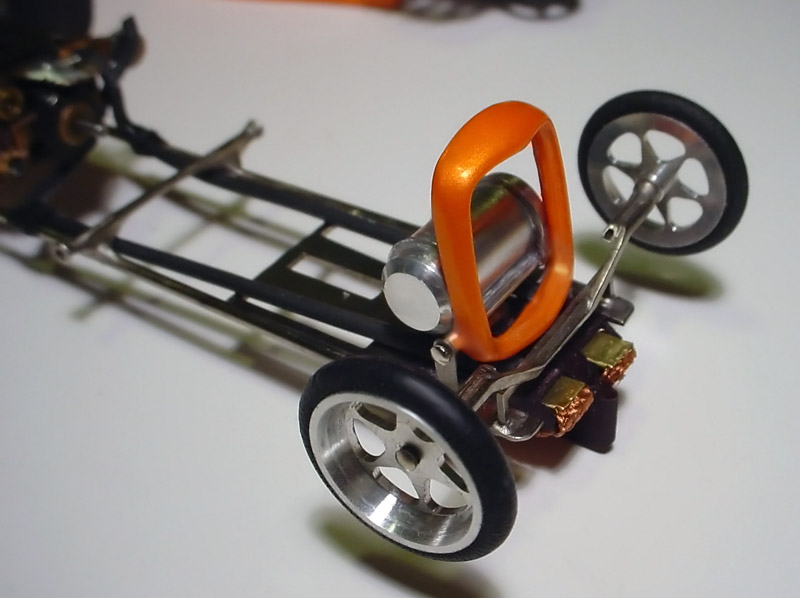 I used one of my favorite chassis for this car, a WRP C-12 narrow inline chassis for 1 3/16" tires. JDS .072" stainless tubing was used for the frame rails, and .062" stainless tubing used for the wheelie down tubes to support the wheelie wheels. After the chassis was silver soldered together, I thoroughly cleaned it and nickel plated it for a bright finish and to keep it from rusting.