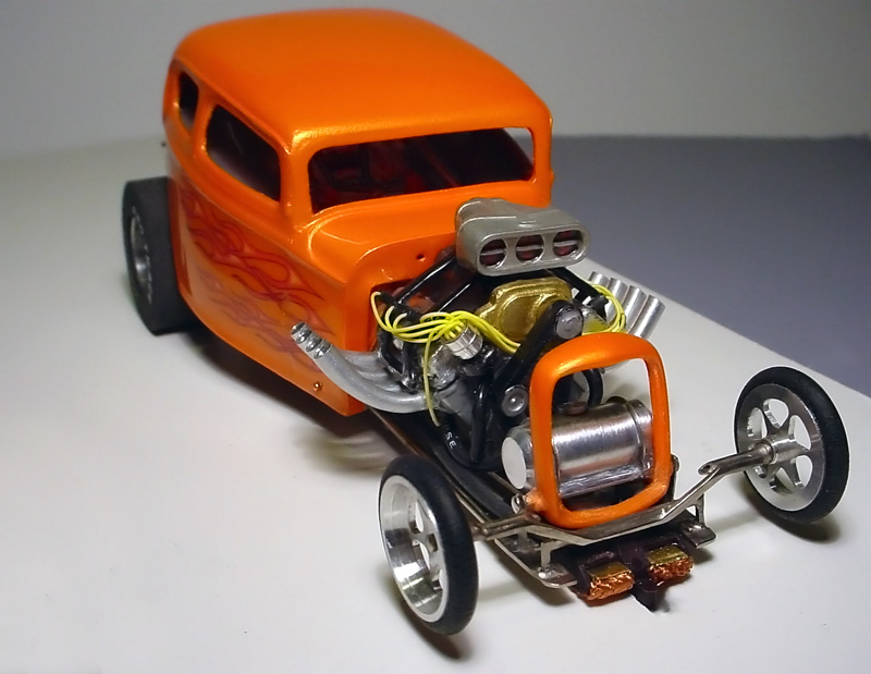 I used Createx pearl orange, water-based paint to paint the body. Once it cured, I sealed it witha coat of PPG automotive polyurethane. 24 hours later, I added the flame decals from Radical Decals. About 3 hours later, two more coats of PPG poly was applied to give it a really smooth, glossy and extremely durable finish. It dried like glass and I didn't even have to rub it out! The blown model kit motor was taken from a Revell funnycar kit, painted and detailed with an aluminum distributor that came as a kit that I got from the Slixx decal site made by Scale Modeling by Chris. I made the zoomie header exhaust pipes from some 1/8" aluminum tubing. After the body was painted, I just used a small amount of hot glue to attach it to the body.
