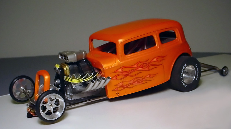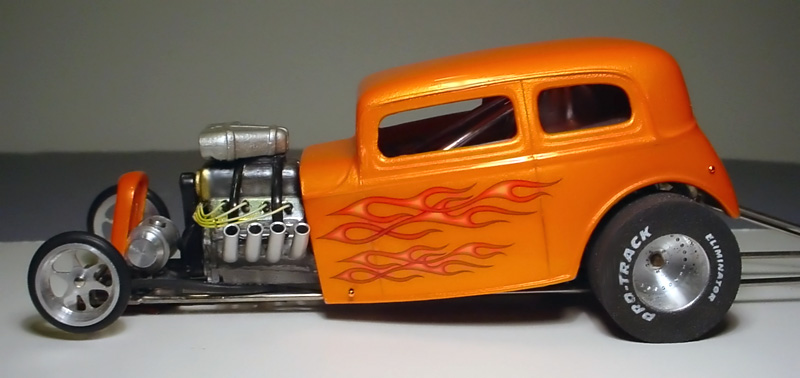Here's one of my favorite cars that I've built thus far, a pearl orange 1932 Ford Victoria altered drag car. The body is made of resin by Jimmy Flintstone. If you'd like to see all of the Flintstone bodies available, go here. I got the front grill (also made of resin) from the Model Car Garage.