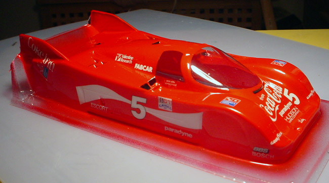 The decals were applied on the inside of the lexan body using Micro-Sol and Micro-Set which makes them seat and stick to the Lexan as if painted on. All of the black vents and scoops were then painted on the inside as well. Then I sprayed the inside with Createx Translucent red (clear red). It actually loooked kinda cool when it was at that stage as it was red but you could easily see thru it. Lastly, I shot it with Parma's Faskolor red pearl. This gives the car a candy red pearl look to it as the Parma pearl red paint looks a little too pinkish all by itself.